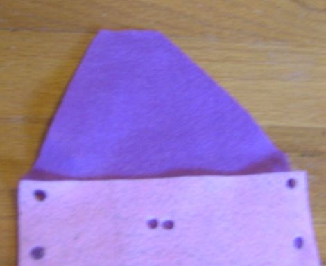 bolsos fieltro agujerosCon los dos trozos de fieltro haz agujeros a una distancia moderada. Haz también un agujero en el centro para el botón. Luego con lazos uniremos los dos trozos de fieltro para crear los bolsos.