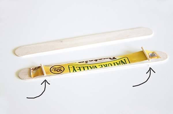 Después cortaremos los palillos o mondadientes para que midan lo mismo que el ancho de los palitos de helado y los colocaremos en los extremos de los palitos de helado, como si fuese un sándwich (un palito de helado por arriba y otro por debajo). Procuraremos que los trozos de mondadientes no estén en el extremo sino un poco más adentro. Cuando lo tengamos hecho lo fijaremos bien con las bandas de goma por cada extremo.