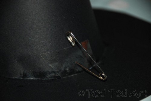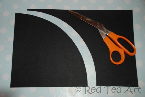 ¡Pasemos al gorrito de bruja! Hacer el gorro de tu pequeña brujita es muy sencillo. En primer lugar, corta un cuarto de círculo en una de las cartulinas negras, enróllalo y grápale las juntas.