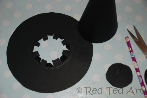 A continuación coge la otra cartulina y recórtala en forma de círculo, teniendo en cuenta que será la base del gorro y haciéndole un círculo interior con pestañas para encajar el gorrito en la cabeza de la pequeña. Pega el cono encajando con este círculo interior. ¿Lo tienes?